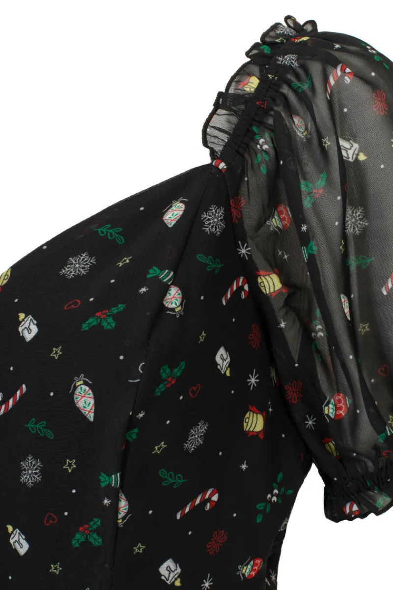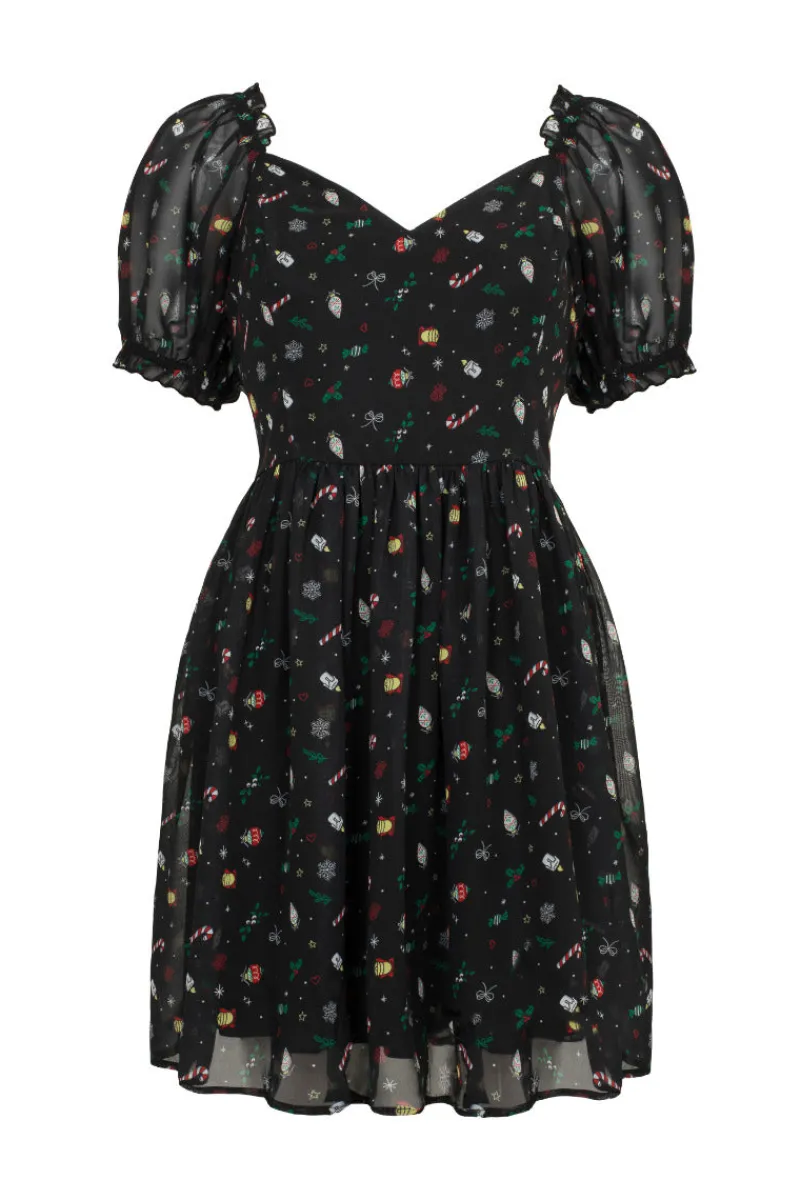 Chiffon printed mini dressBlack base with mini festive motifs printed all overSweetheart neckline , fitted bodiceShort p…
