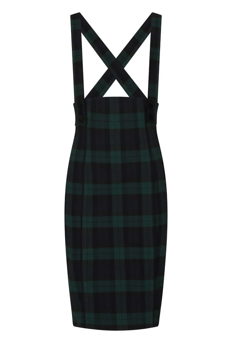 Machine washable, do not tumble dry, wash separately”}’ data-sheets-userformat='{“2″:10497,”3”:{“1″:0,”3″:1},”11″:4,”14”:{“1″:3,”3″:1},”16”:11}’>Pencil pinafore skirt in navy/green tartan. - <span data-sheets-value='{"1":2,"2":"Pencil pinafore skirt in navy/green tartan.