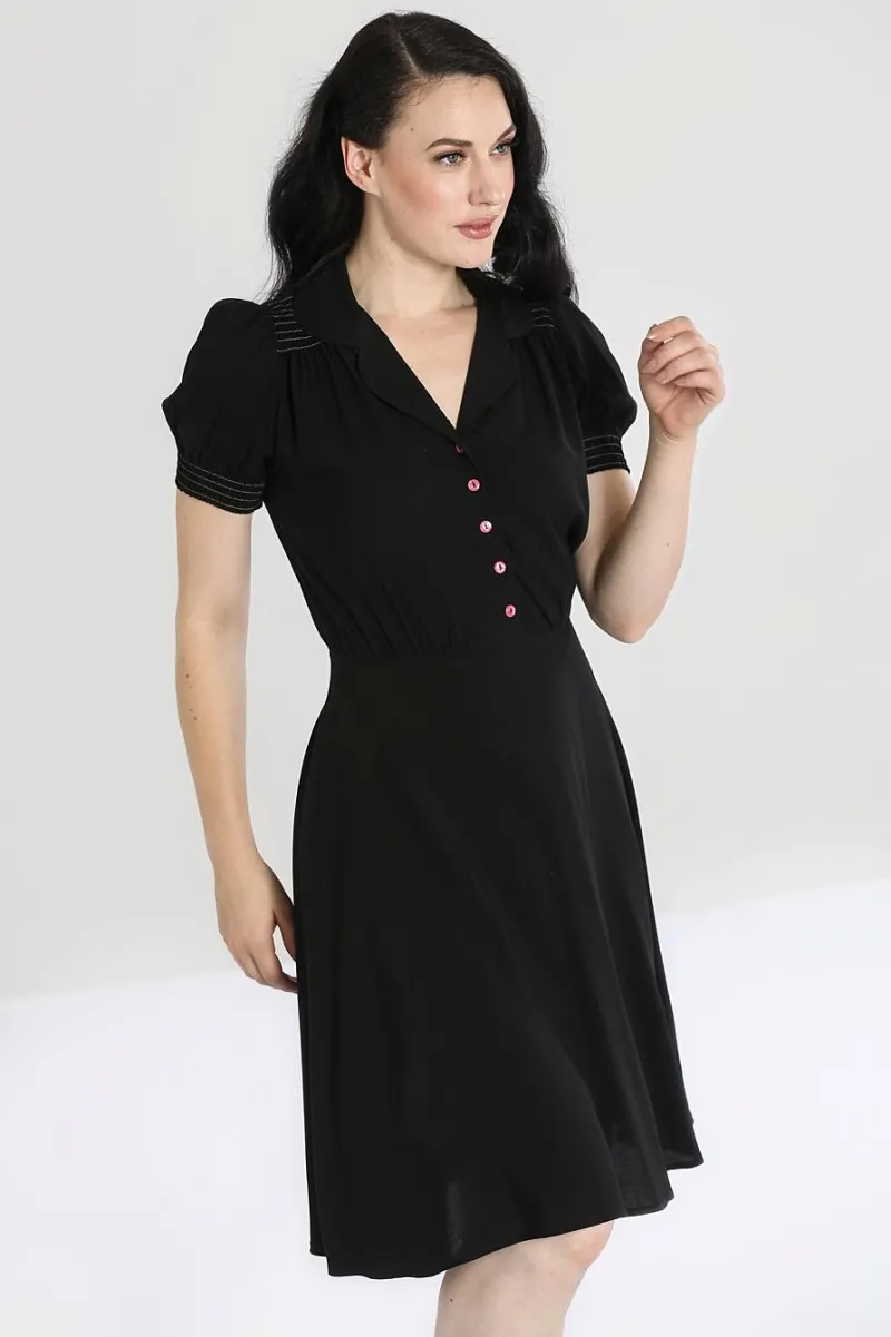 Black dress with short sleevesPink buttons down the centre frontGathers at shoulderBodice is gathered at waistZip in the…